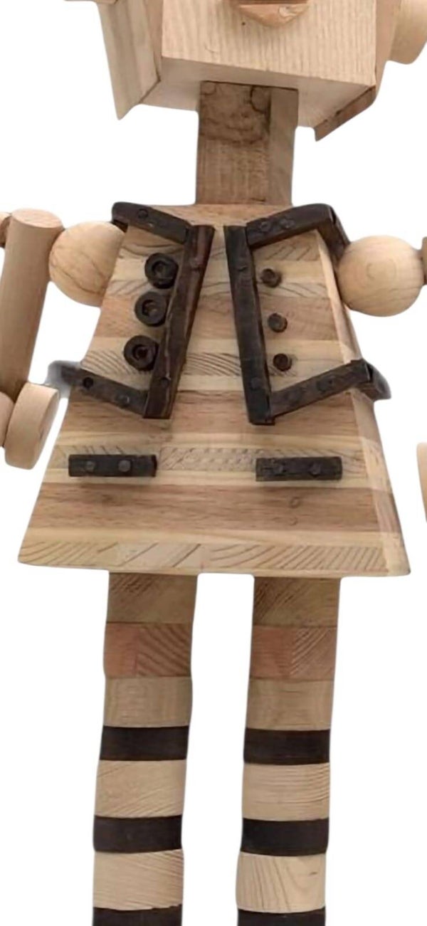 Son regard doux, ses bras articulés et ses détails sculptés témoignent d’un travail minutieux et profondément humain. Une pièce qui évoque l’enfance, le futur rêvé, et la beauté d’un artisanat chargé d’âme.
