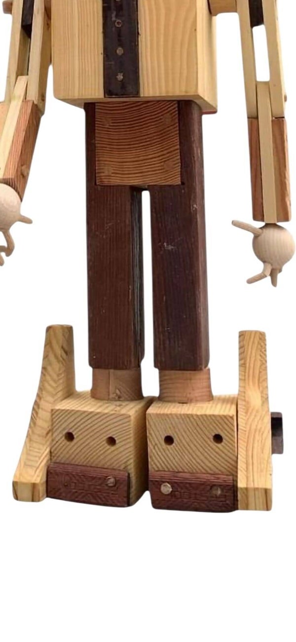 Avec ses bras articulés, ses pieds sculptés et son regard curieux, il évoque la nostalgie des jouets anciens et la poésie de l’imaginaire futuriste.